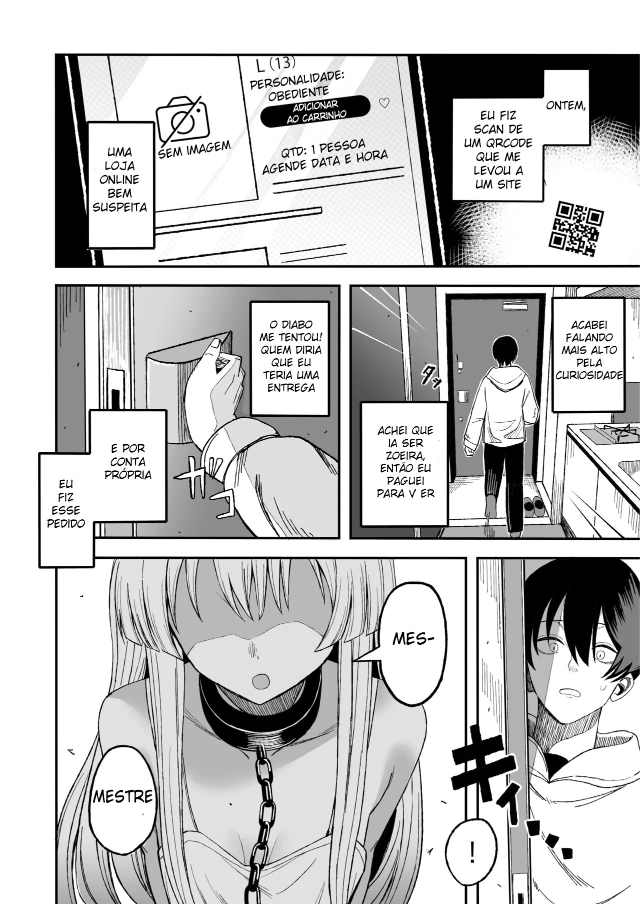 Lendo um mangá adulto, o protagonista esperava ser mais ousado, logo esse leitor se frustra com o que considera ser uma história “sem graça”. No entanto, a decepção se transforma em curiosidade quando ele encontra um QR Code no final, ”tenha sua própria escrava sexual”. Ao escanear o código, ele fica surpreso, por que realmente uma escrava surge na sua porta pronto para fazer de tudo.