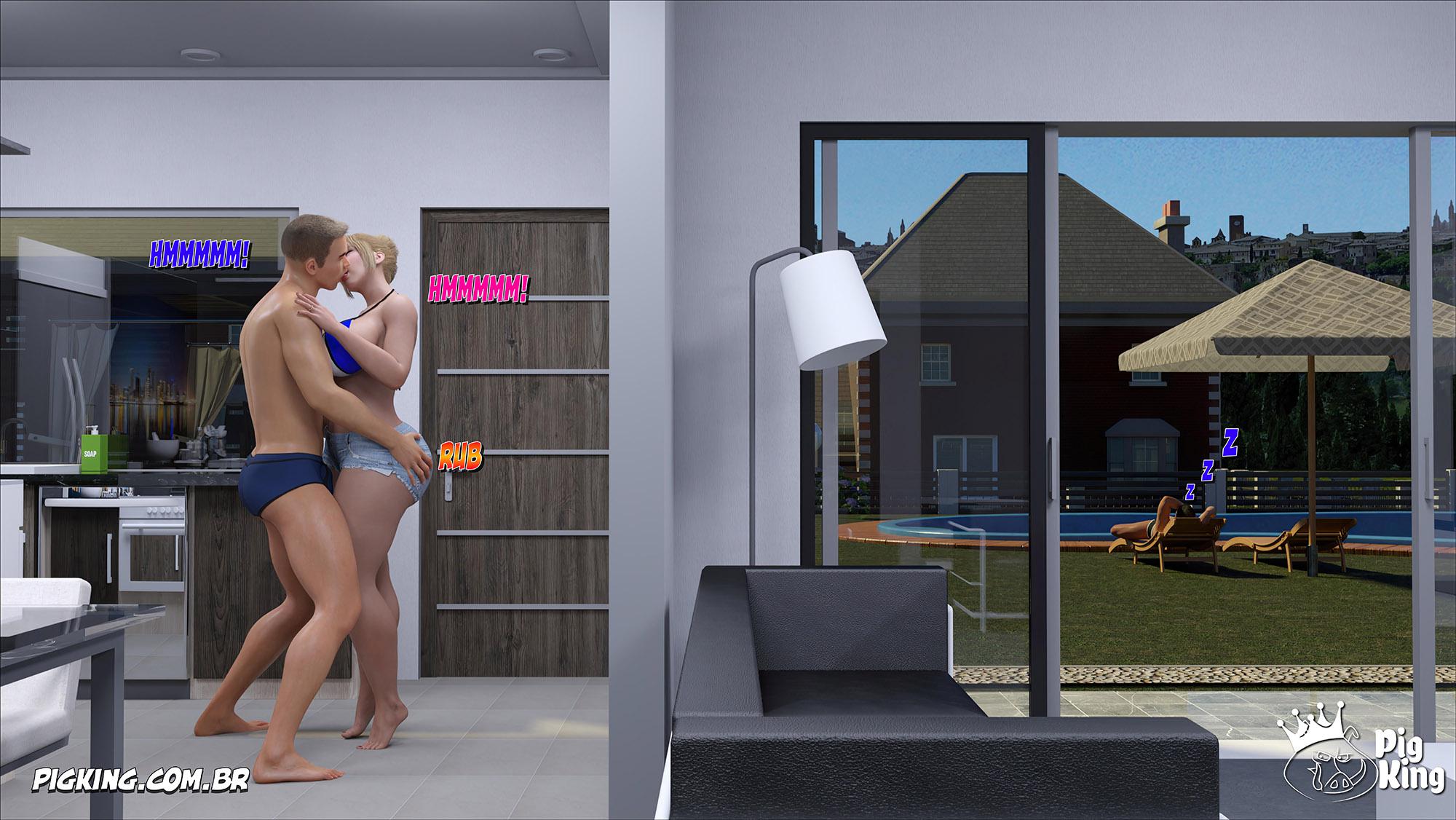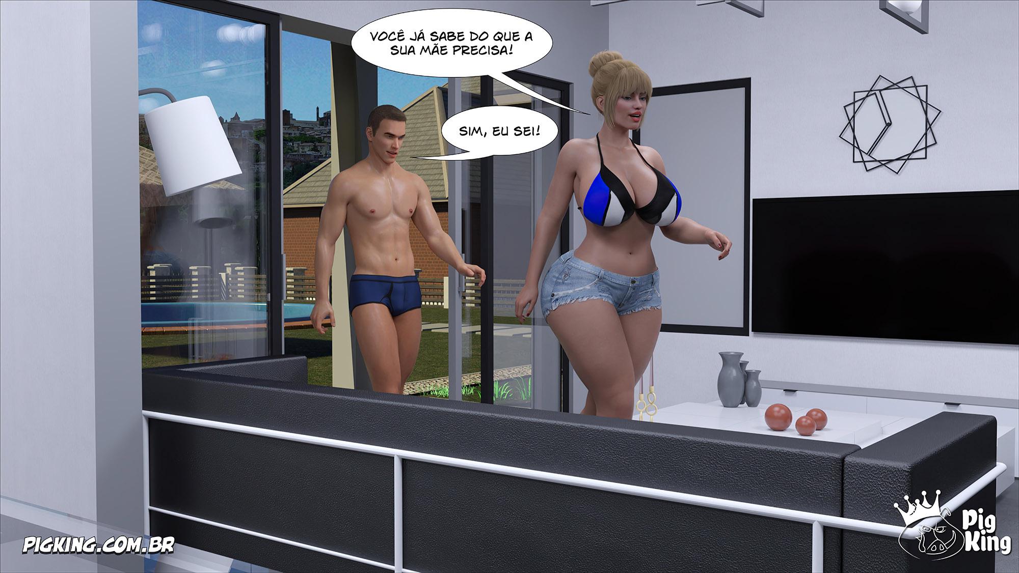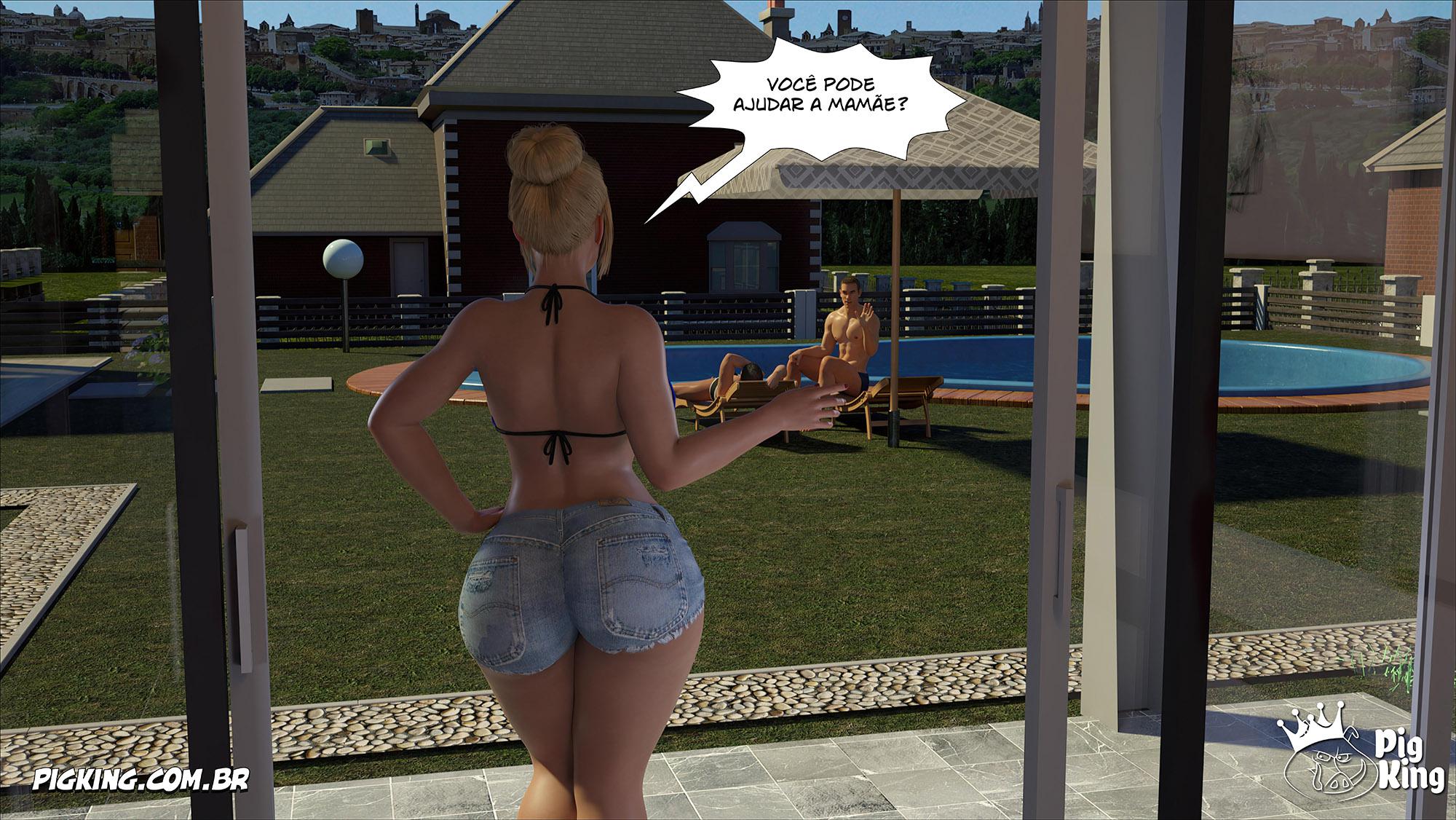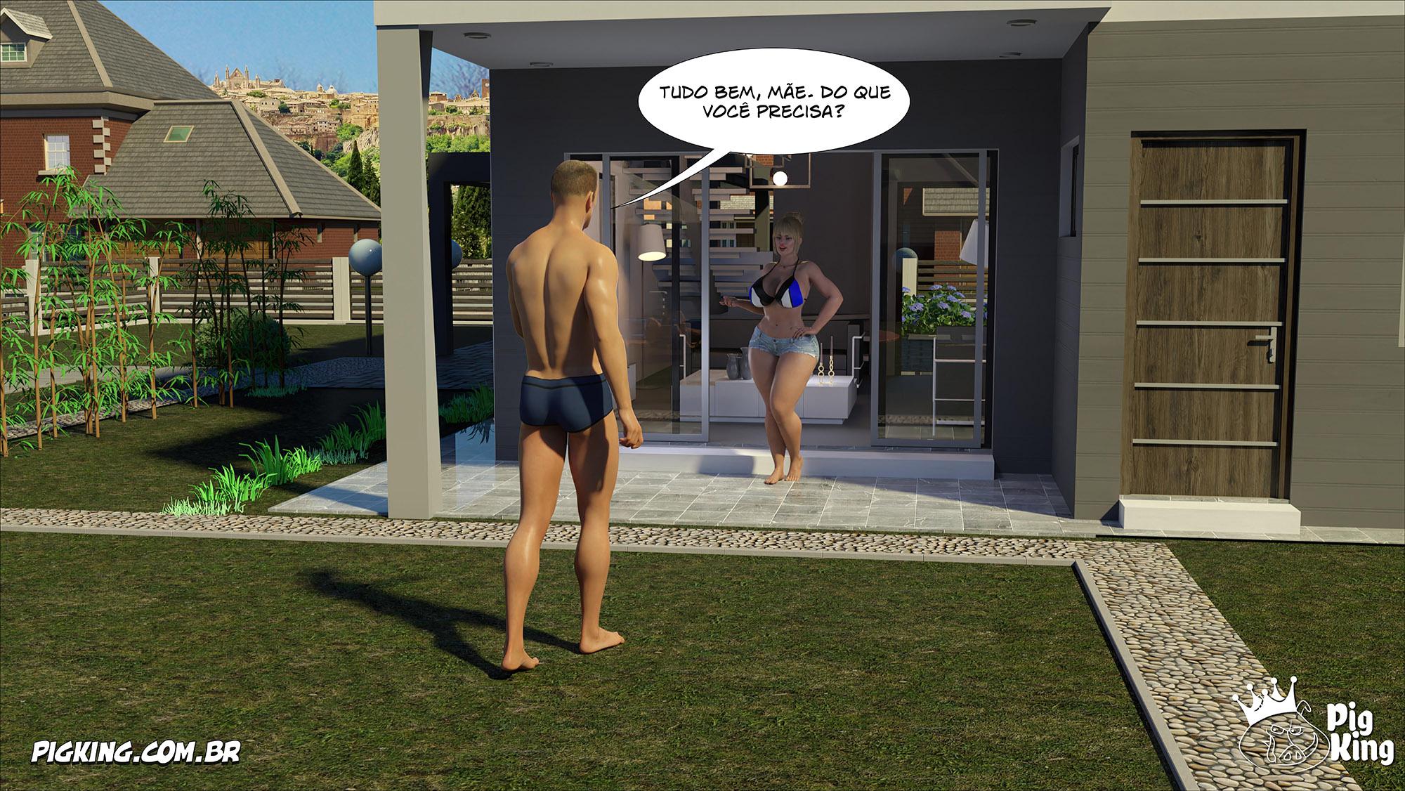 Janine acaba de foder com o mendigo na praça e vai para casa como se nada tivesse acontecido. Ela e insaciável pois fodeu com o mendigo e já esta com vontade de transar de novo. Ela já pensa em hentai incesto com seu filho para satisfazer essa vontade que ela esta de foder de novo. Então ela vai ate a piscina onde esta seu marido e seu filho. Então ela chama seu filho que já sabe o que a safada quer e eles vão para a cozinha foder.