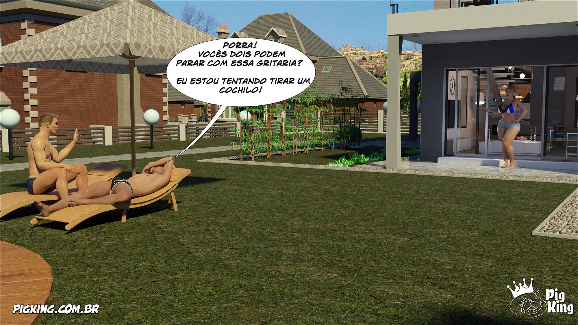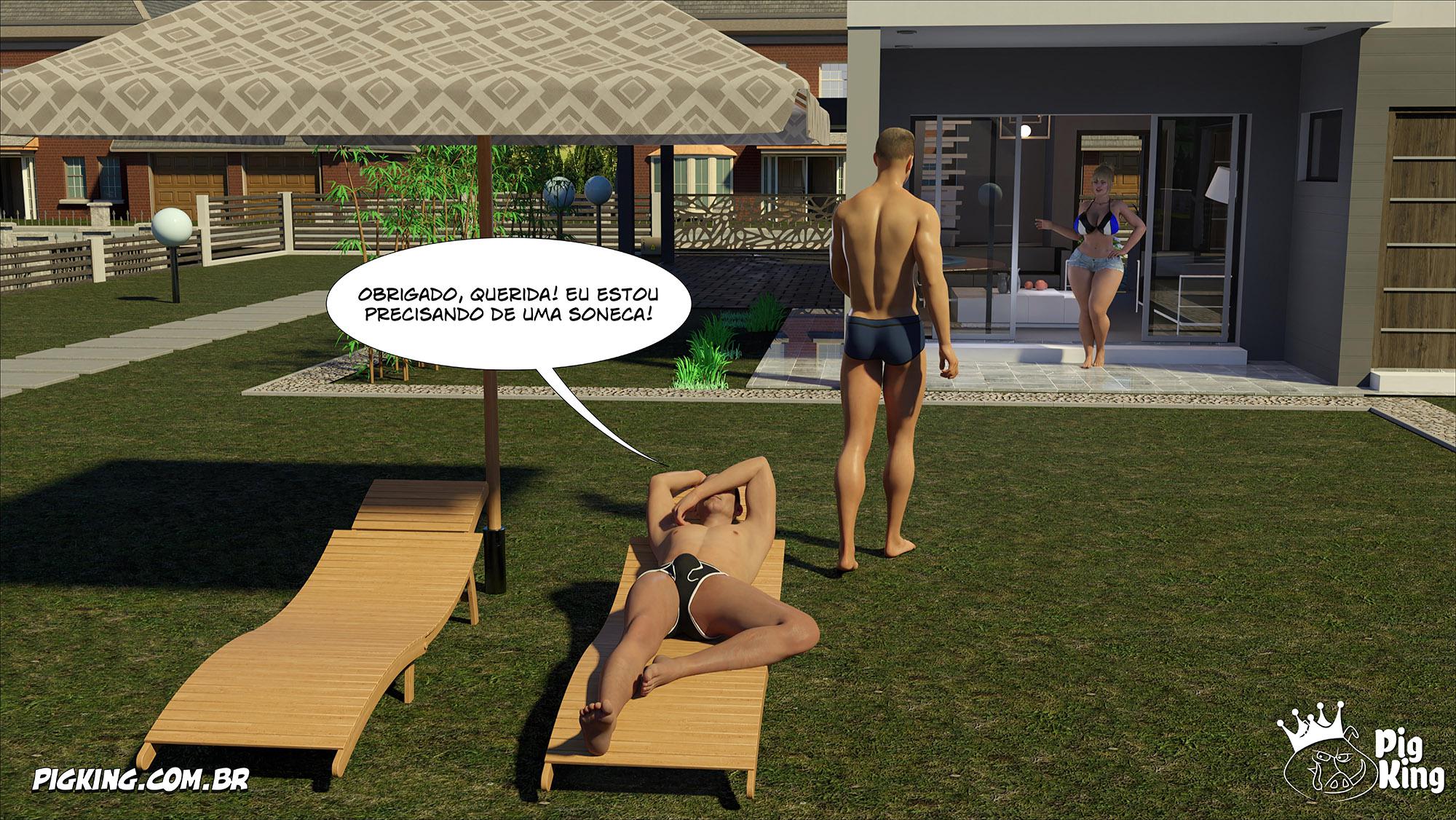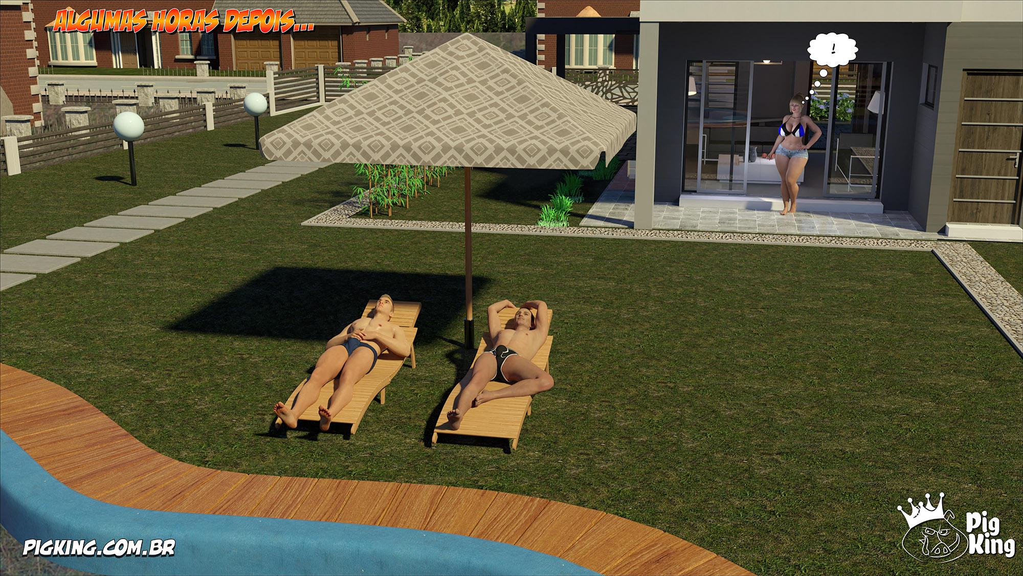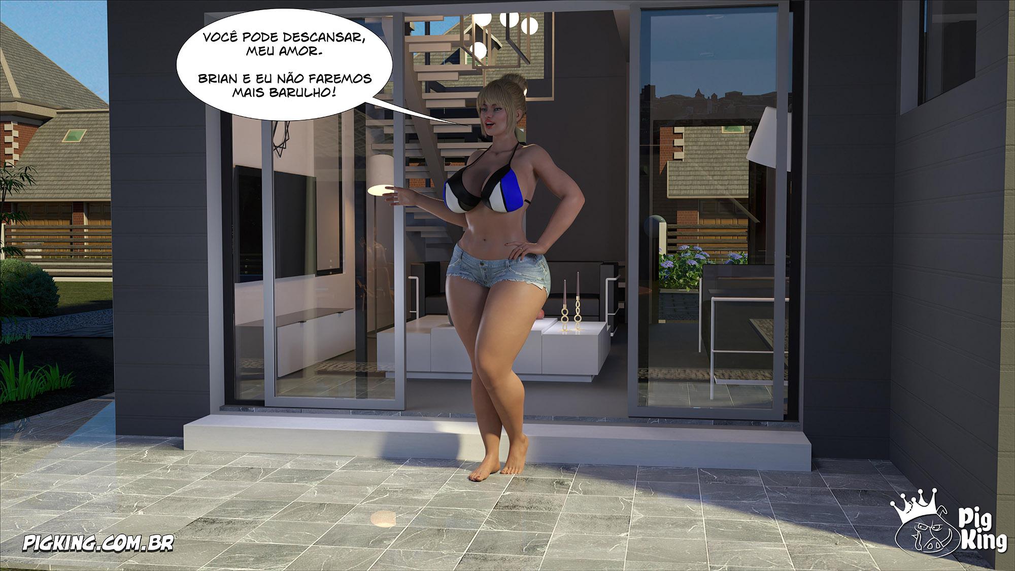 Janine acaba de foder com o mendigo na praça e vai para casa como se nada tivesse acontecido. Ela e insaciável pois fodeu com o mendigo e já esta com vontade de transar de novo. Ela já pensa em hentai incesto com seu filho para satisfazer essa vontade que ela esta de foder de novo. Então ela vai ate a piscina onde esta seu marido e seu filho. Então ela chama seu filho que já sabe o que a safada quer e eles vão para a cozinha foder.