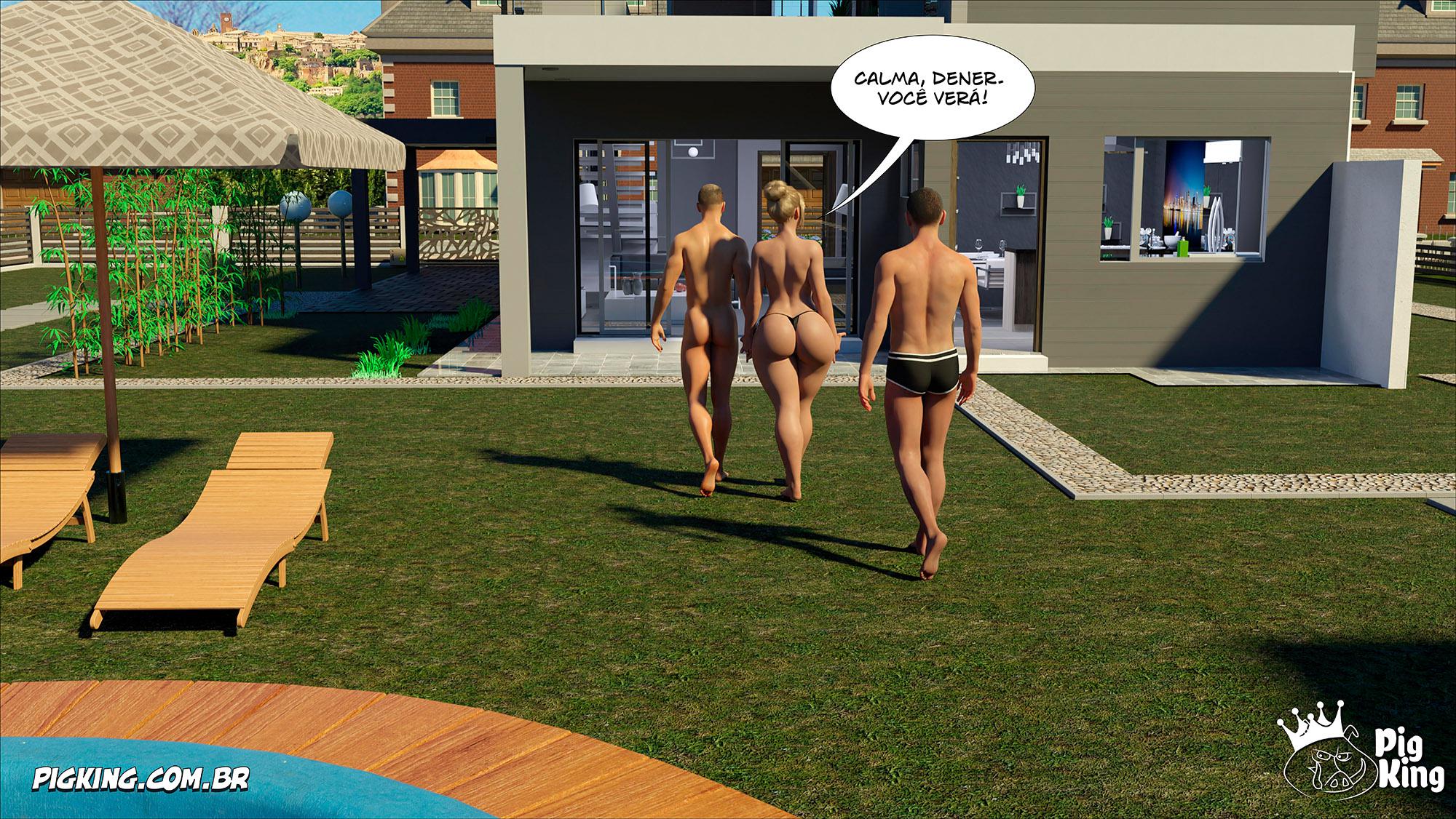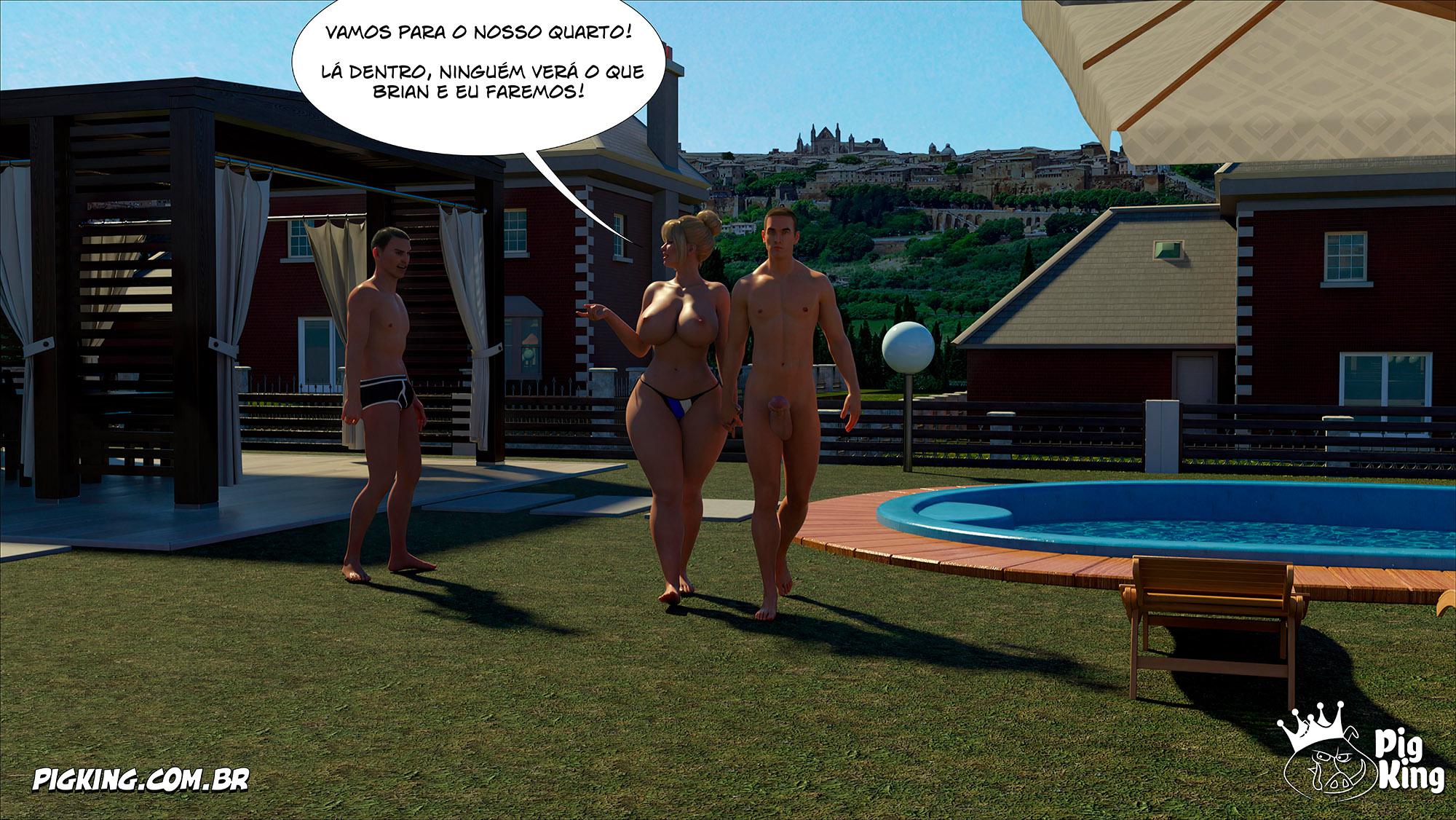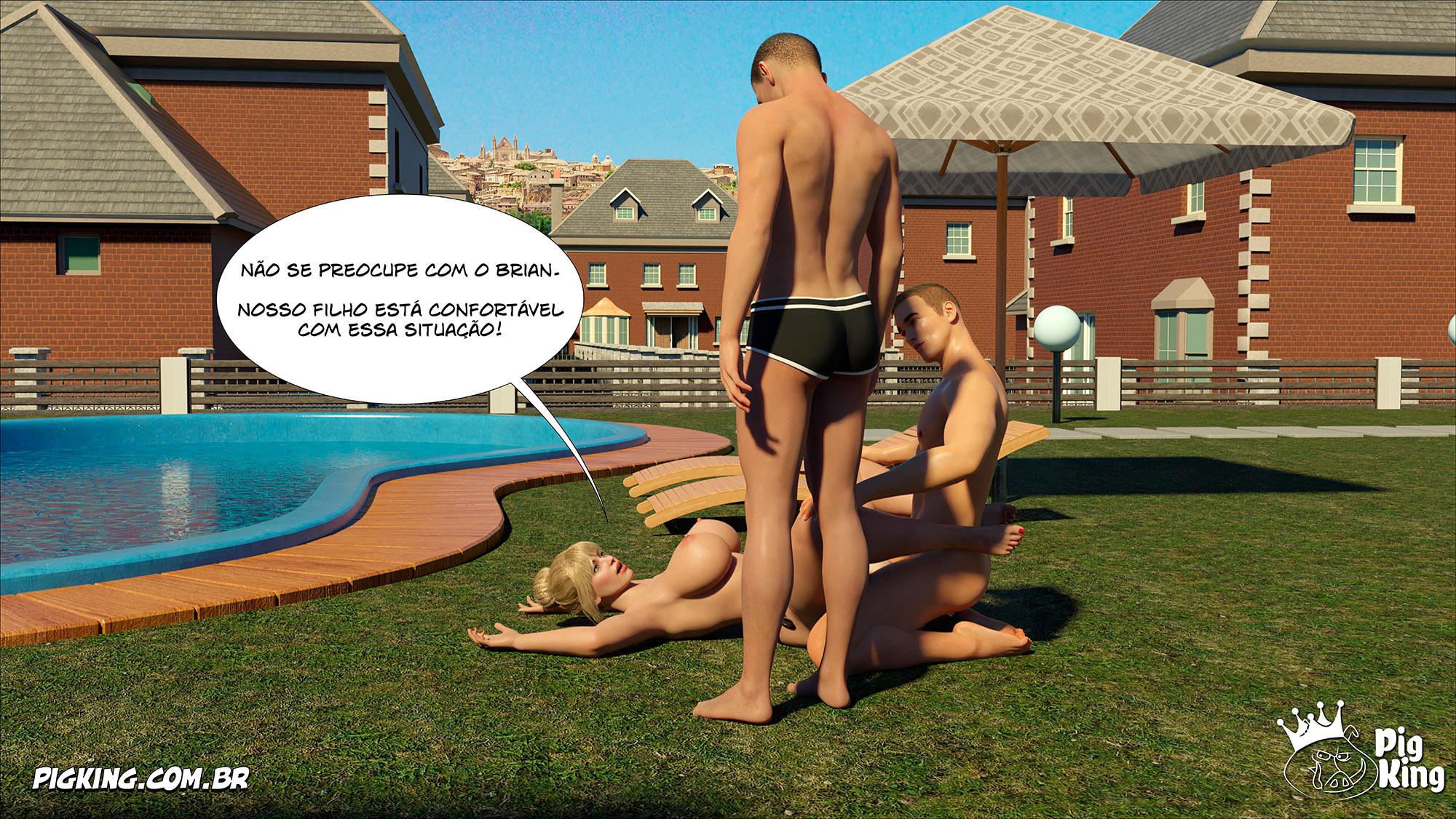 Janine estava com o seu filho na área de piscina e ela acaba ficando excitada e deixa que ele a foda. Mas o seu marido estava assistindo tudo e vai tirar satisfação com eles. Então Janine consegue amansar o corno e os três vão para o quarto.