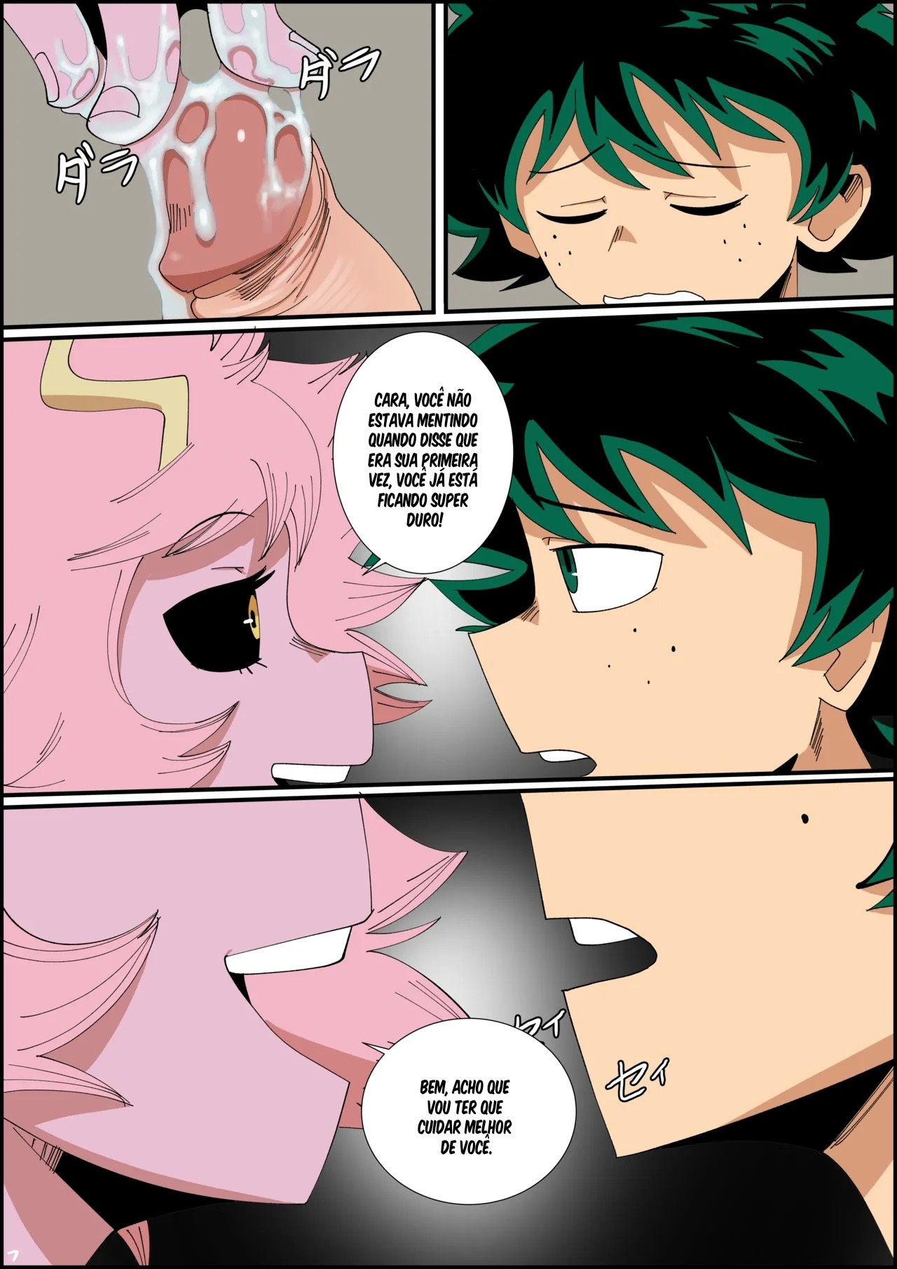 Em plena aula, Midoriya é interrompido por Mina, que lhe mostra uma foto ousada de si mesma para encher ele de tesão, e para ver sua reação. Envergonhado e sem saber onde enfiar a cara, Midoriya mal consegue responder, enquanto Aizawa, o professor, os repreende por falarem durante a aula. Mas isso não irá deter a putaria deles.