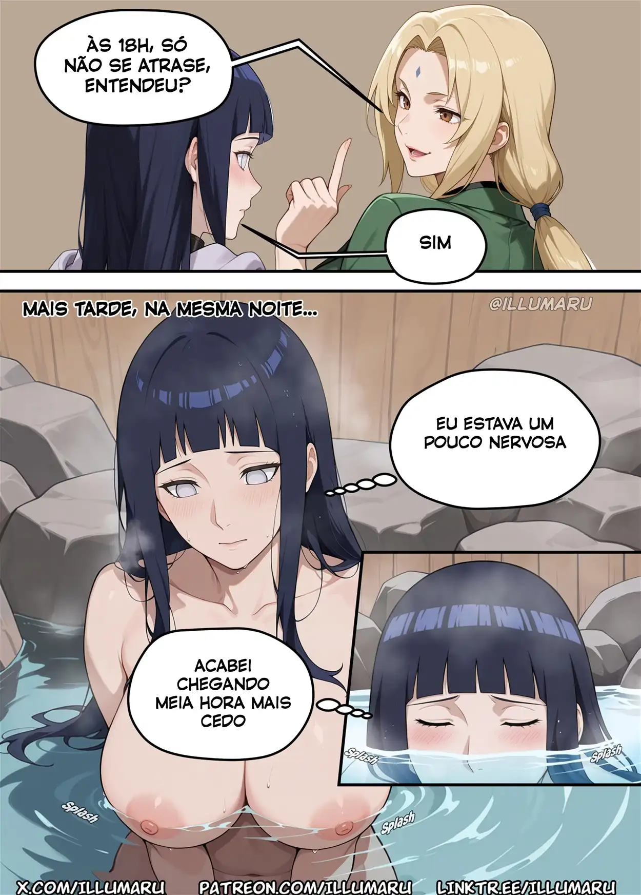 Naruto gostou muito de se divertir nas fontes termais com Tsunade. Então ele pergunta para ela quando que eles vão se encontrar nas fontes termais novamente. E a gostosa marca com ele de se encontrar essa noite. Mas ela percebe que Hinata estava espionando Naruto. E Tsunade decide levar Hinata para se encontrar com Naruto junto com ela essa noite para se divertirem nas fontes termais.