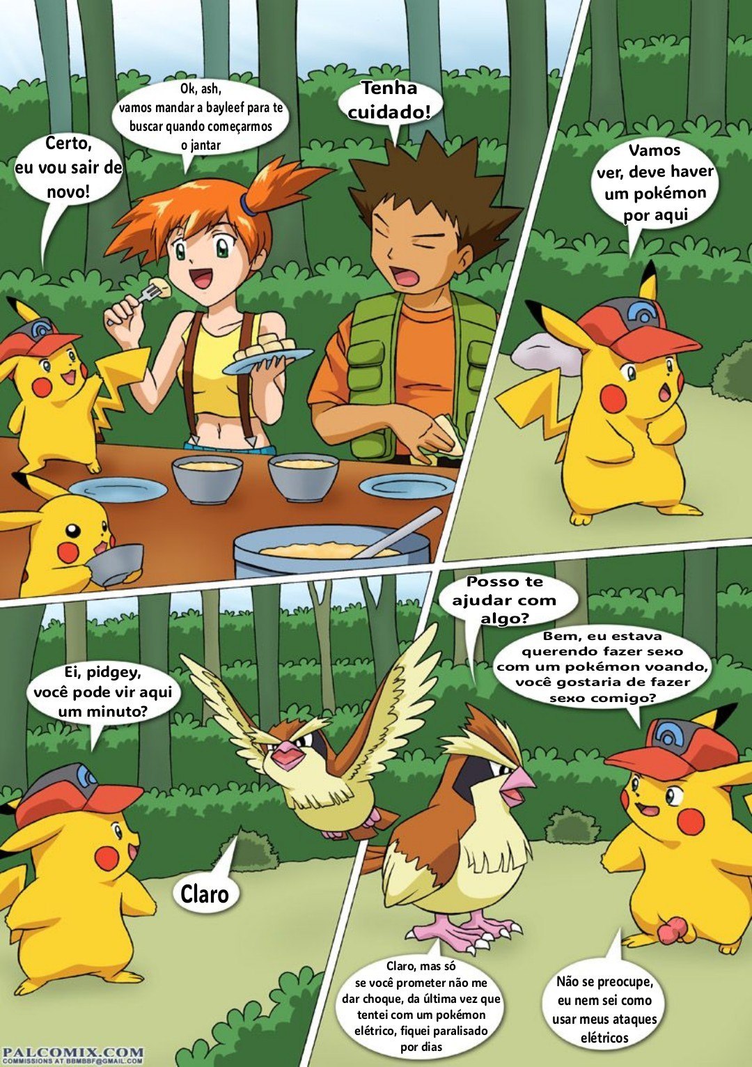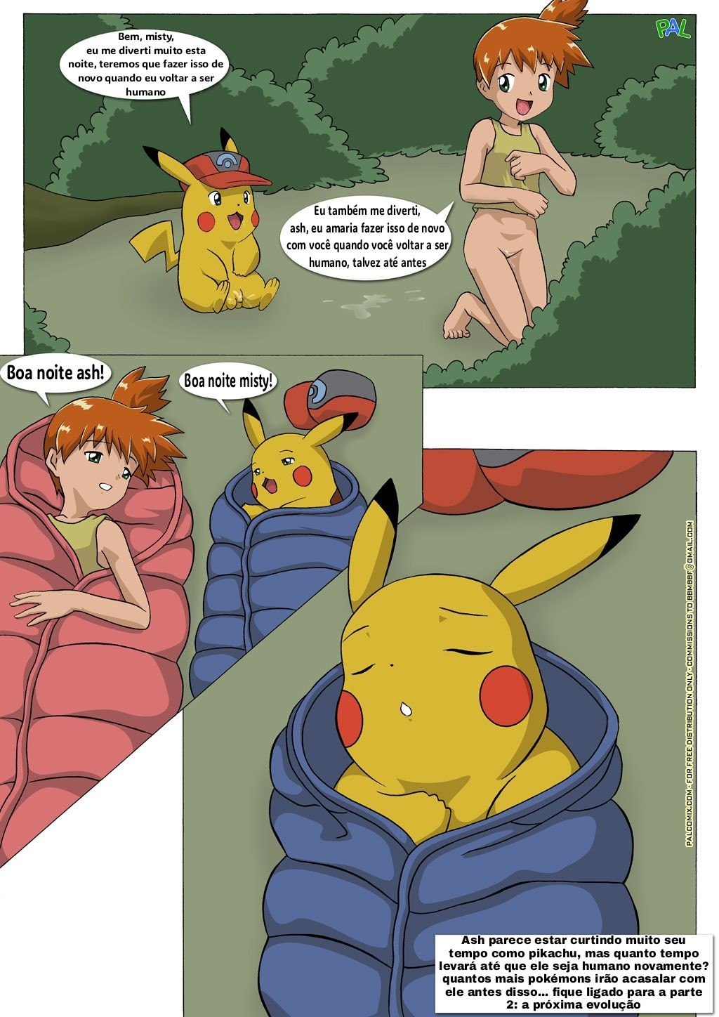Misty estava perdida na floresta pois eles estavam indo procurar a próxima cidade onde tem um ginásio que vai ter uma batalha Pokémon. Então enquanto eles preparavam o jantar os dois Pikachus saíram para para dar uma volta na floresta. E eles acabaram encontrando dois Pokémons que estavam cruzando. Então ao ver essa cena os dois pikachus começaram a cruzar um com o outro também.